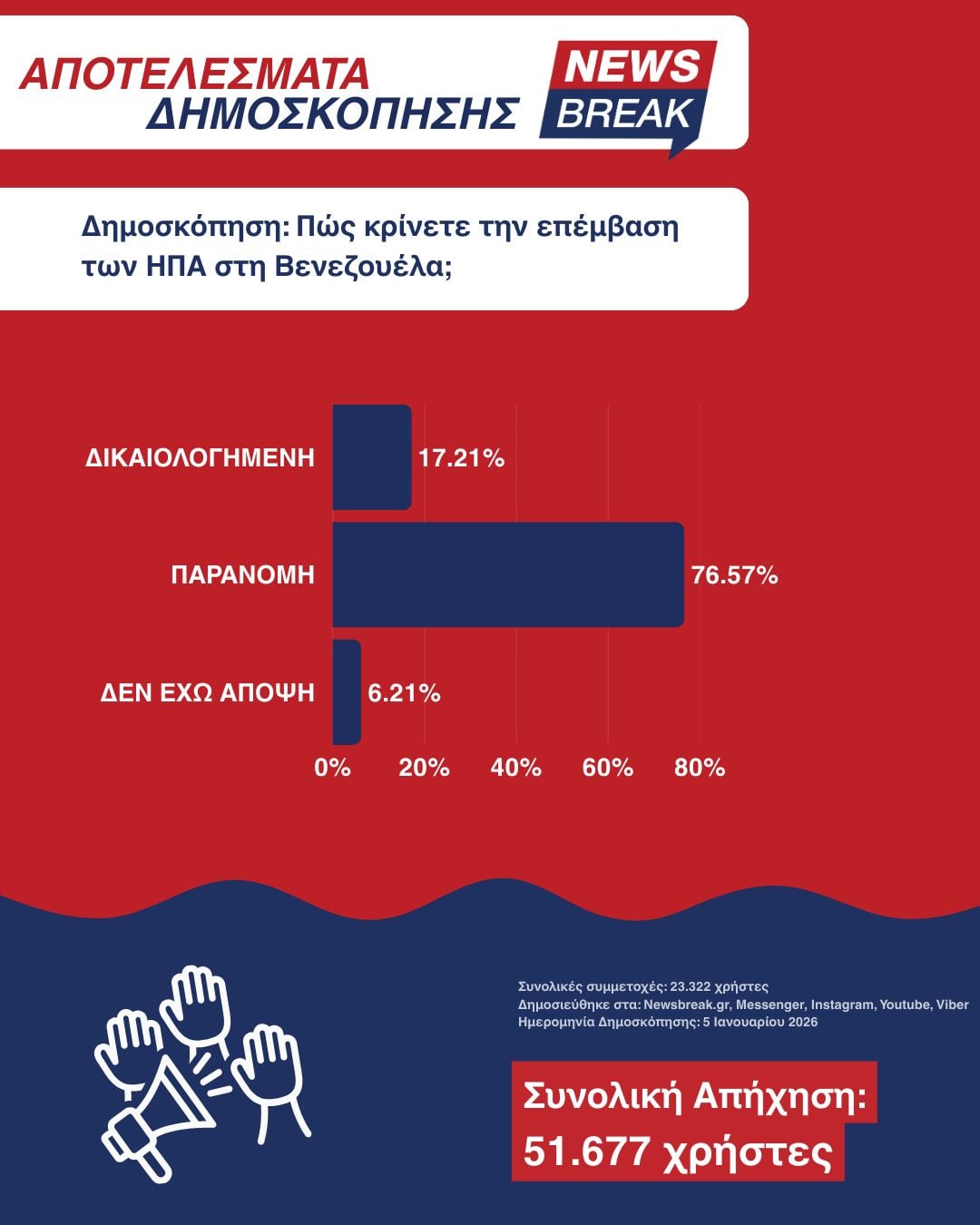 Συνολικά, 23.322 πολίτες συμμετείχαν στη δημοσκόπηση, ενώ η συνολική απήχηση έφτασε τους 51.667 χρήστες, καταδεικνύοντας το έντονο ενδιαφέρον για ένα θέμα που συνδέεται άμεσα με το διεθνές δίκαιο, τις ισορροπίες ισχύος και τον ρόλο των μεγάλων δυνάμεων στη διεθνή σκηνή.