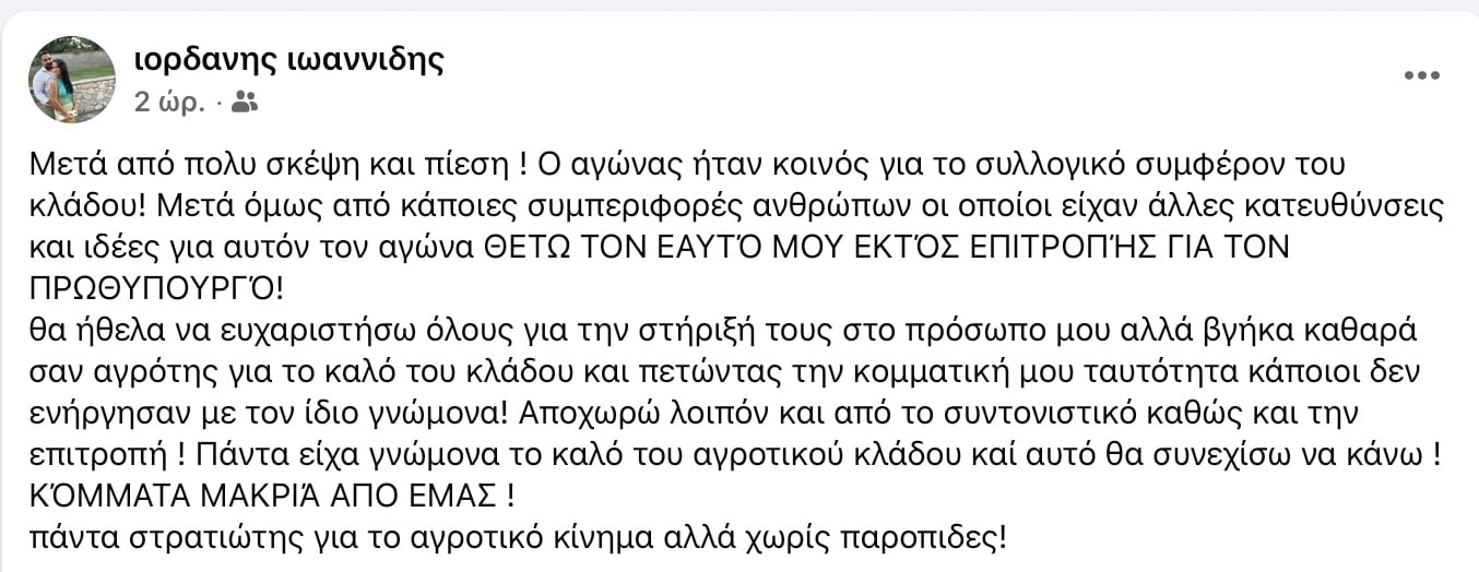 Ο Ιορδάνης Ιωαννίδης, μέλος του Διοικητικού Συμβουλίου της Ενωτικής Ομοσπονδίας Αγροτικών Συλλόγων Λάρισας, ανακοίνωσε την παραίτησή του από το συντονιστικό του μπλόκου Νίκαιας και από την επιτροπή για τη συνάντηση με τον Πρωθυπουργό.