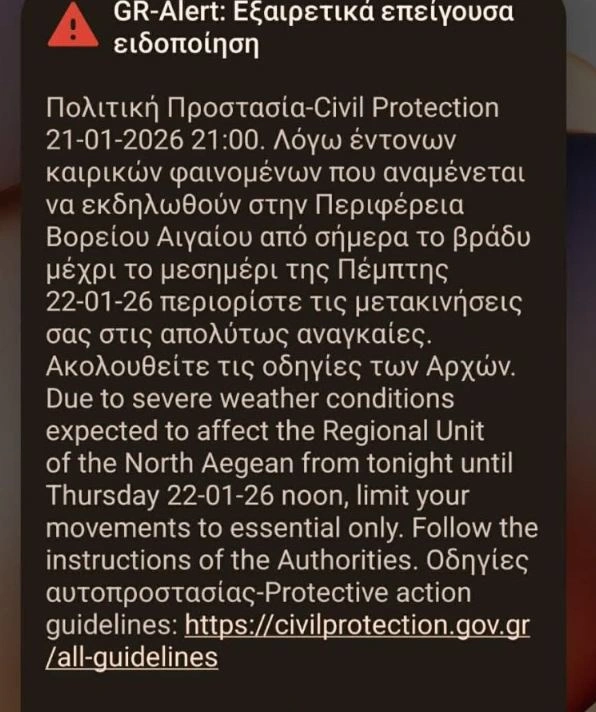 «Λόγω έντονων καιρικών φαινομένων που αναμένεται να εκδηλωθούν στην Περιφέρεια Βορείου Αιγαίου από σήμερα το βράδυ μέχρι το μεσημέρι της Πέμπτης περιορίστε τις μετακινήσεις σας στις απολύτως αναγκαίες», αναφέρει το μήνυμα.