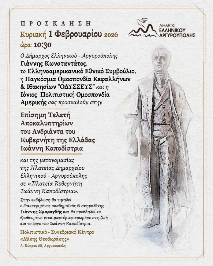 Ο Δήμαρχος Ελληνικού – Αργυρούπολης Γιάννης Κωνσταντάτος, το Ελληνοαμερικανικό Εθνικό Συμβούλιο, η Παγκόσμια Ομοσπονδία Κεφαλλήνων & Ιθακησίων ”ΟΔΥΣΣΕΥΣ” και η Ιόνιος Πολιτιστική Ομοσπονδία Αμερικής σας προσκαλούν στην Επίσημη Τελετή Αποκαλυπτηρίων του Ανδριάντα του Κυβερνήτη της Ελλάδας Ιωάννη Καποδίστρια.