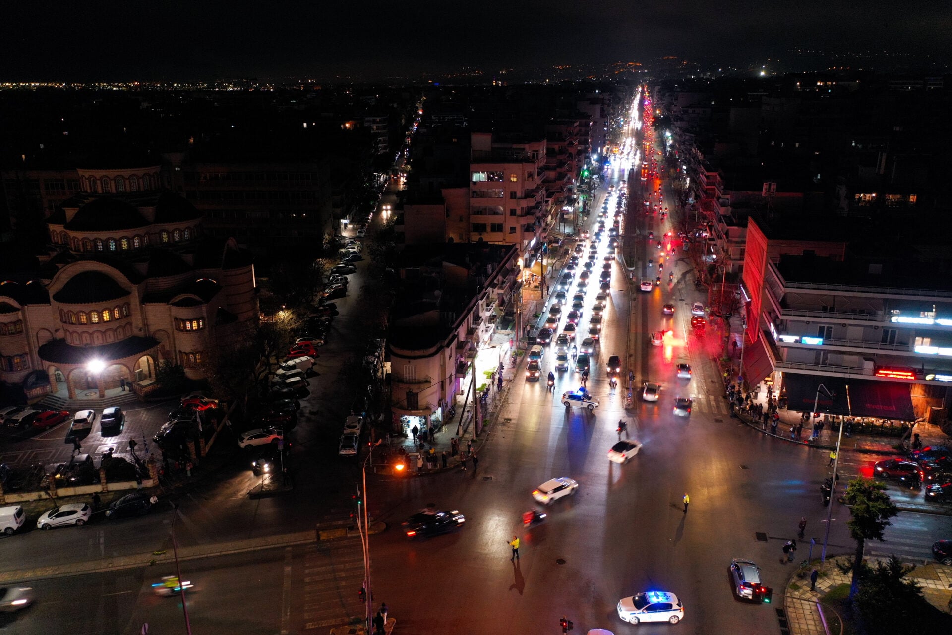 Λίγο πριν από τις 19:00, ξεκίνησε η πομπή μέσω κεντρικών δρόμων της πόλης, περνώντας από τη Λεωφόρο Γεωργικής Σχολής, την Εθνικής Αντιστάσεως, τη Βασιλίσσης Όλγας, την οδό Βούλγαρη, την Κωνσταντίνου Καραμανλή και την Κλεάνθους, συνοδευόμενη από κόρνες και συνθήματα.