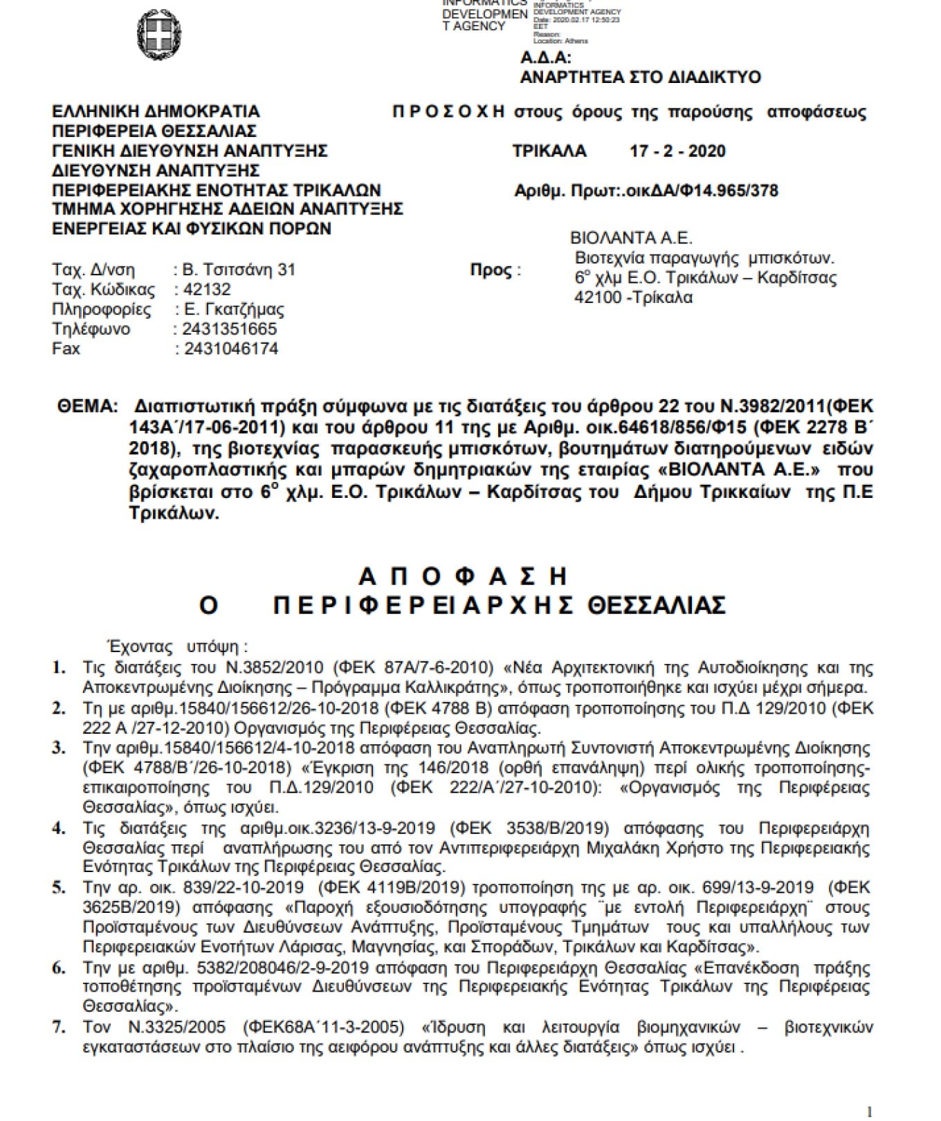 Μέσα στο σύνολο των εγγράφων που έχουν δει το φως της δημοσιότητας αναφορικά με τη Βιολάντα, ξεχωρίζει μία ιδιαίτερα κρίσιμη καταγραφή. Το 2020, επίσημο έγγραφο της Περιφέρειας Θεσσαλίας επισημαίνει ρητά ότι οι δύο δεξαμενές προπανίου της μονάδας δεν είχαν εγκατασταθεί στην κατάλληλη τοποθεσία, γεγονός που τώρα εξετάζεται σε συνάρτηση με τις περιστάσεις που οδήγησαν στην τραγωδία.