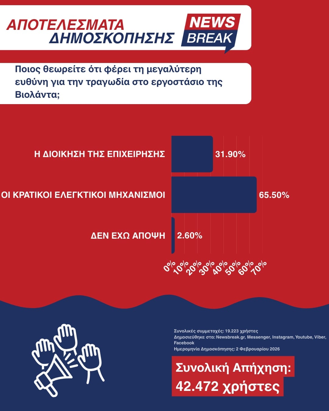 Έντονο ενδιαφέρον και σαφείς τοποθετήσεις κατέγραψε η δημοσκόπηση του newsbreak.gr με ερώτημα: «Ποιος θεωρείτε ότι φέρει τη μεγαλύτερη ευθύνη για την τραγωδία στο εργοστάσιο της Βιολάντα;», φέρνοντας στο προκήνιο ζητήματα ασφακείας στην εργασία, κρατικού ελέγχου και λογοδοσίας.