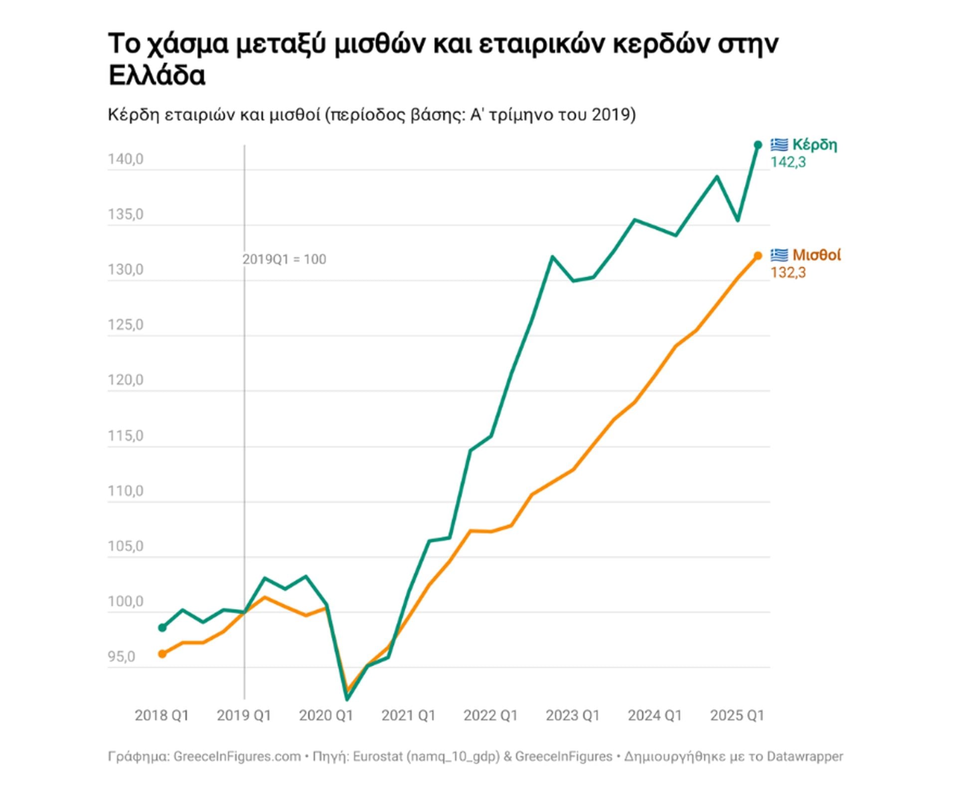 Το αποτέλεσμα είναι ένα χάσμα 10 ποσοστιαίων μονάδων, που δείχνει ότι η οικονομική ανάπτυξη των επιχειρήσεων δεν μεταφέρεται ισότιμα στους εργαζόμενους.