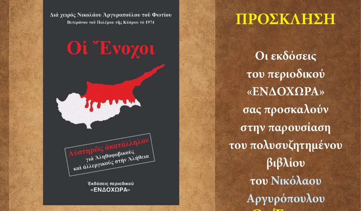 Σε μία σειρά εκδηλώσεων για την τουρκική εισβολή του 1974 στην Κύπρο, ο βετεράνος ΕΛΔΥΚάριος Νίκος Αργυρόπουλος που πολέμησε με τους συντρόφους του τους βάρβαρους εισβολείς, παρουσιάζει το βιβλίο του «Οι Ένοχοι».