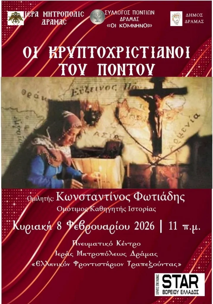 Μια σημαντική πτυχή της ποντιακής ιστορίας, αυτή των Κρυπτοχριστιανών, αναμένεται να αναδειχθεί σε ειδική εκδήλωση μνήμης που διοργανώνεται στη Δράμα. Την Κυριακή 8 Φεβρουαρίου 2026, στις 11:00 π.μ., το Πνευματικό Κέντρο της Ιεράς Μητροπόλεως Δράμας, που φέρει τον εμβληματικό τίτλο «Ελληνικόν Φροντιστήριον Τραπεζούντας», θα φιλοξενήσει μια διοργάνωση αφιερωμένη στην πολιτιστική και θρησκευτική κληρονομιά του Ποντιακού Ελληνισμού.