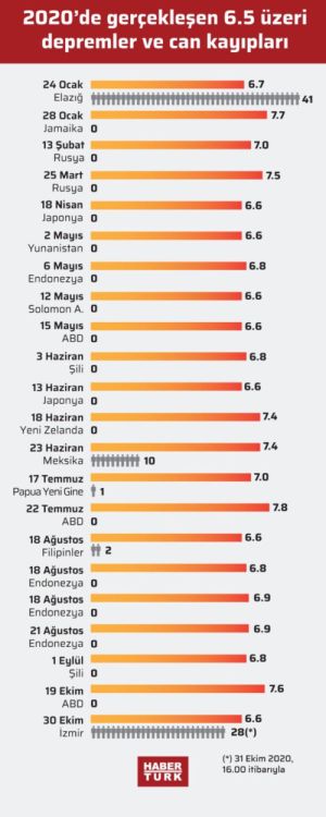Σύμφωνα με το πρακτορείο ειδήσεων Habertürk, 20 χώρες έχουν σεισμούς με μέγεθος μεγαλύτερο από 6,5 Ρίχτερ το 2020 (μέχρι τώρα), με συνολικό απολογισμό 13 θανάτους, που συμπεριλαμβάνουν τους 10 στον σεισμό των 7,4 Ρίχτερ στο Μεξικό στις 23 Ιουνίου και τον έναν νεκρό στον σεισμό μεγέθους 7,0 Ρίχτερ που έγινε στην Παπούα Νέα Γουινέα στις 17 Ιουλίου.