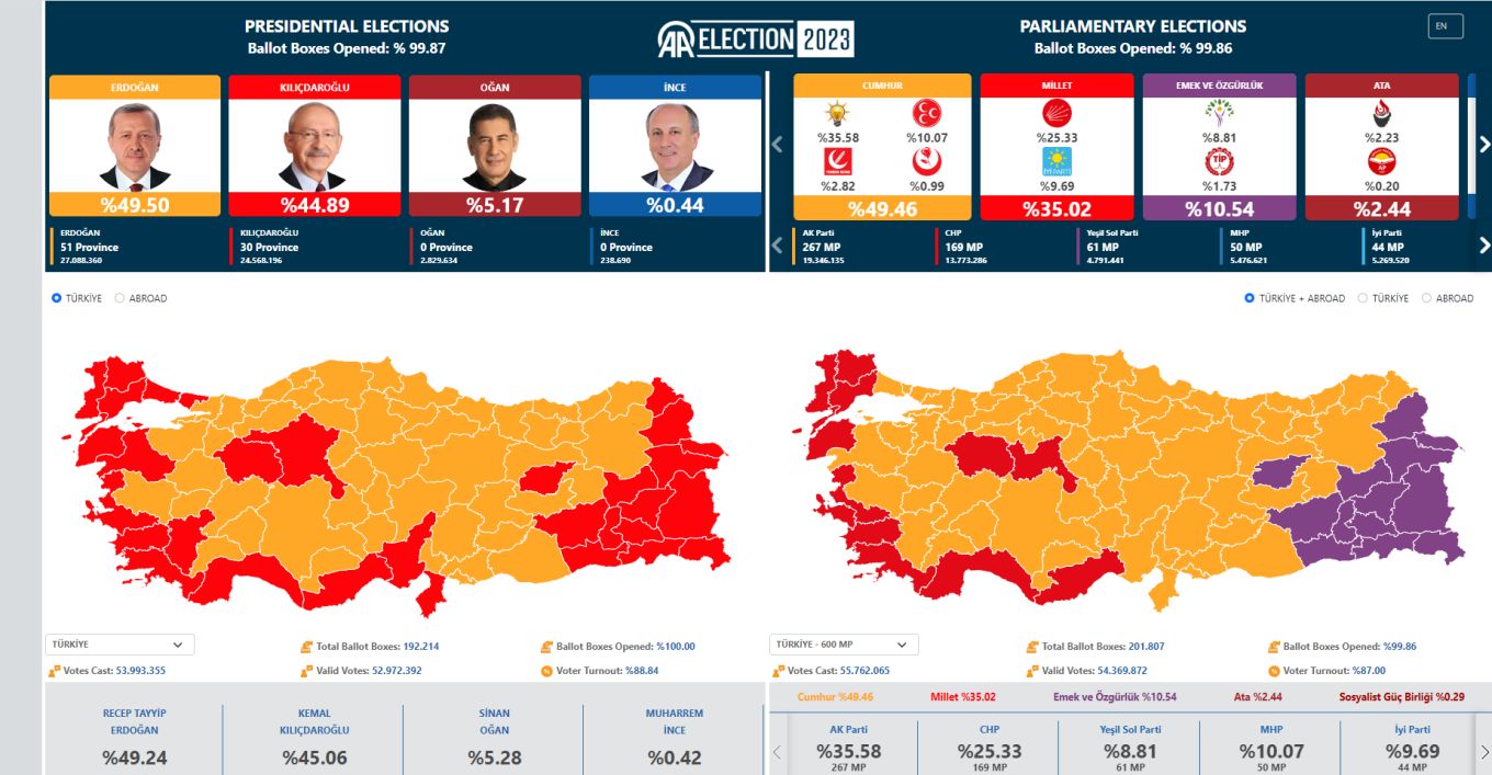 Σύμφωνα με τα αποτελέσματα που ανακοινώθηκαν ο Ρετζέπ Ταγίπ Ερντογάν συγκέντρωσε 49,50%, ο Κεμάλ Κιλιτσντάρογλου 44,89%, ο Σινάν Ογάν 5,17% και ο Μουχαρέμ Ιντζέ 0,44%.