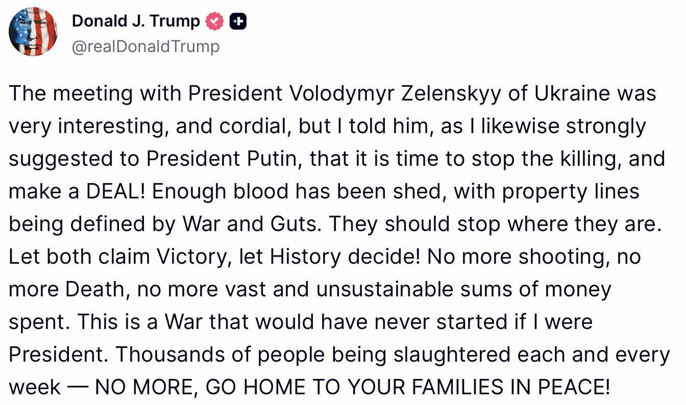 «H συνάντηση με τον Ουκρανό πρόεδρο Βολοντίμιρ Ζελένσκι ήταν πολύ ενδιαφέρουσα και εγκάρδια, αλλά του είπα, όπως τόνισα στον πρόεδρο Πούτιν, ότι ήρθε η ώρα να σταματήσουν οι σκοτωμοί και να βρεθεί μια συμφωνία», έγραψε μεταξύ άλλων ο Τραμπ, συμπληρώνοντας ότι οι αντιμαχόμενες πλευρές θα πρέπει «να σταματήσουν εκεί που βρίσκονται».