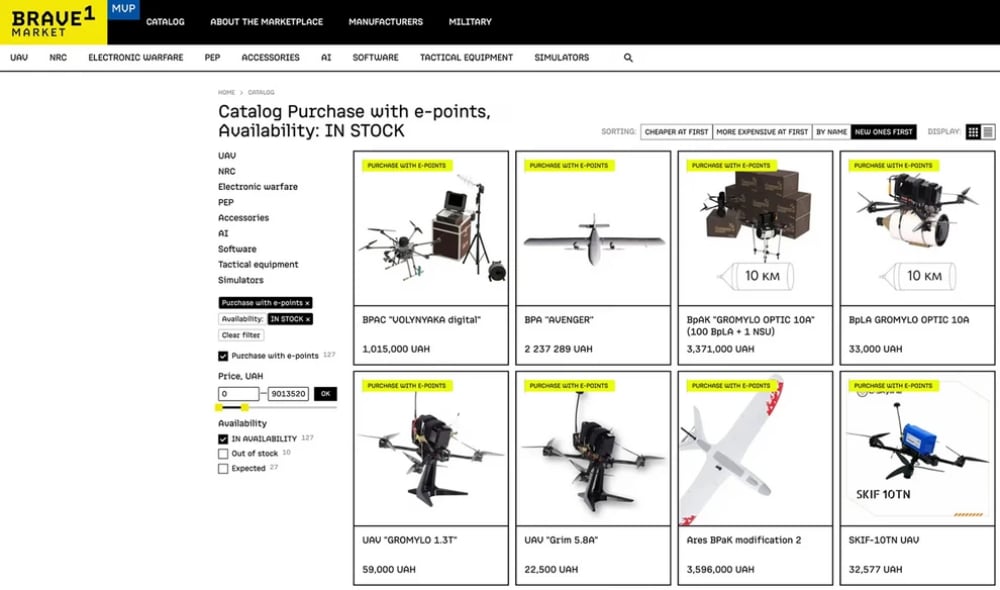 Μέσω της ιστοσελίδας Brave1 που λειτουργεί σαν την Amazon, αλλά προσφέροντας μόνο όπλα, οι Ουκρανοί στρατιώτες μπορούν να διαλέξουν ανάμεσα σε 100 διαφορετικά drones, όπλα, κτλ. Μπορούν, επίσης, να ζητήσουν ενισχύσεις σε έμψυχο υλικό, εφόσον θεωρούν ότι η μονάδα τους πρέπει να επεκταθεί.