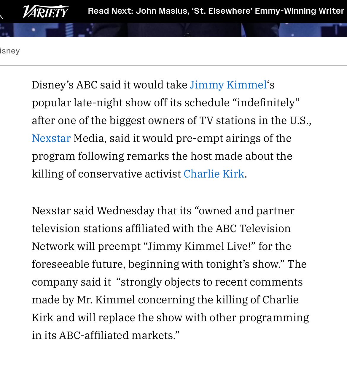 Οι τηλεοπτικοί όμιλοι Sinclair και Nexstar Media, δύο μεγαλύτεροι ιδιοκτήτες σταθμών του ABC στις ΗΠΑ, διέκοψαν τη μετάδοση της εκπομπής του Κίμελ, ασκώντας πίεση στη Disney,