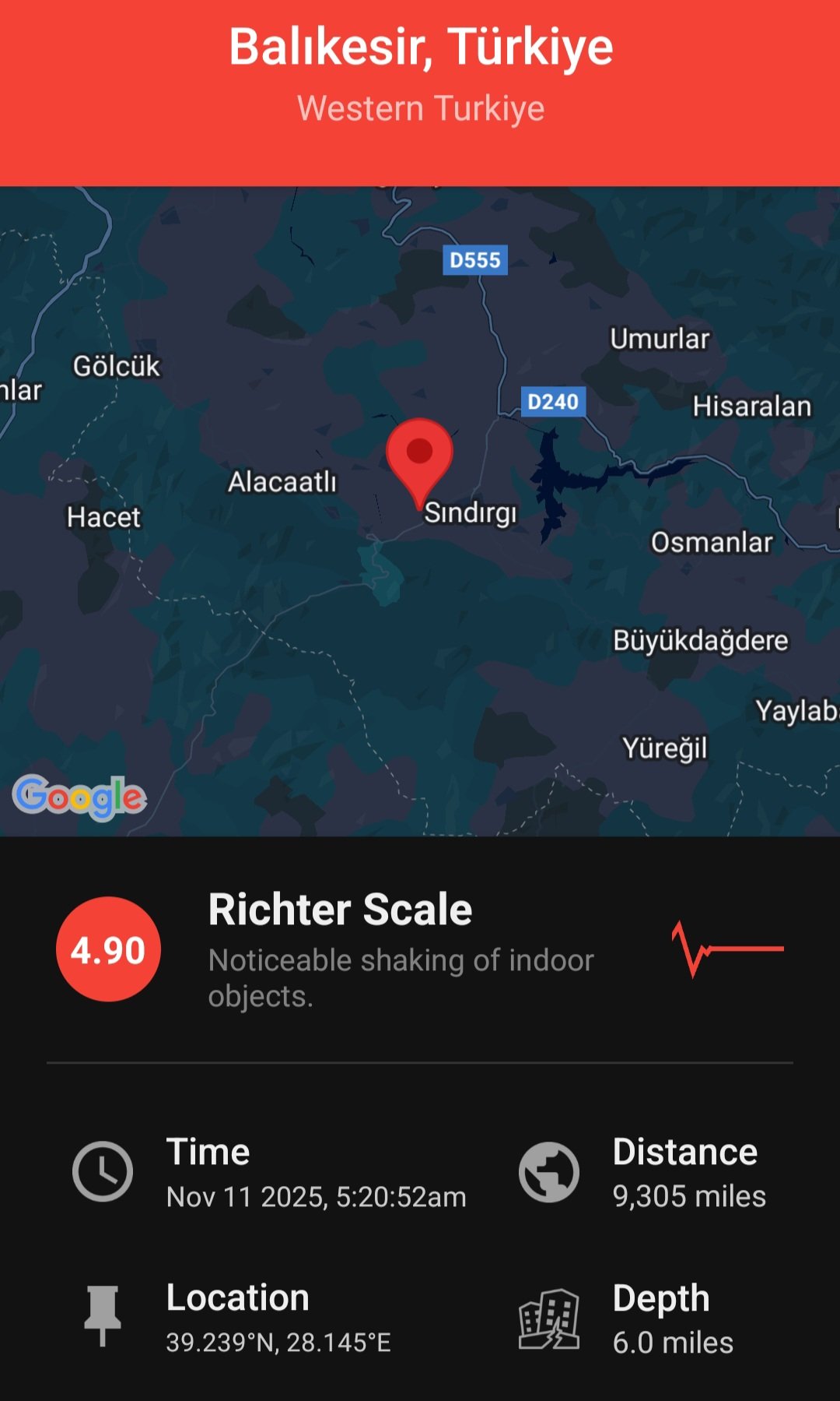 Preliminary magnitude 4.9 earthquake struck western Turkey near Sındırgı, about 51 km southeast of Balıkesir, on November 10, 2025 (21:20 local). #deprem #sismo