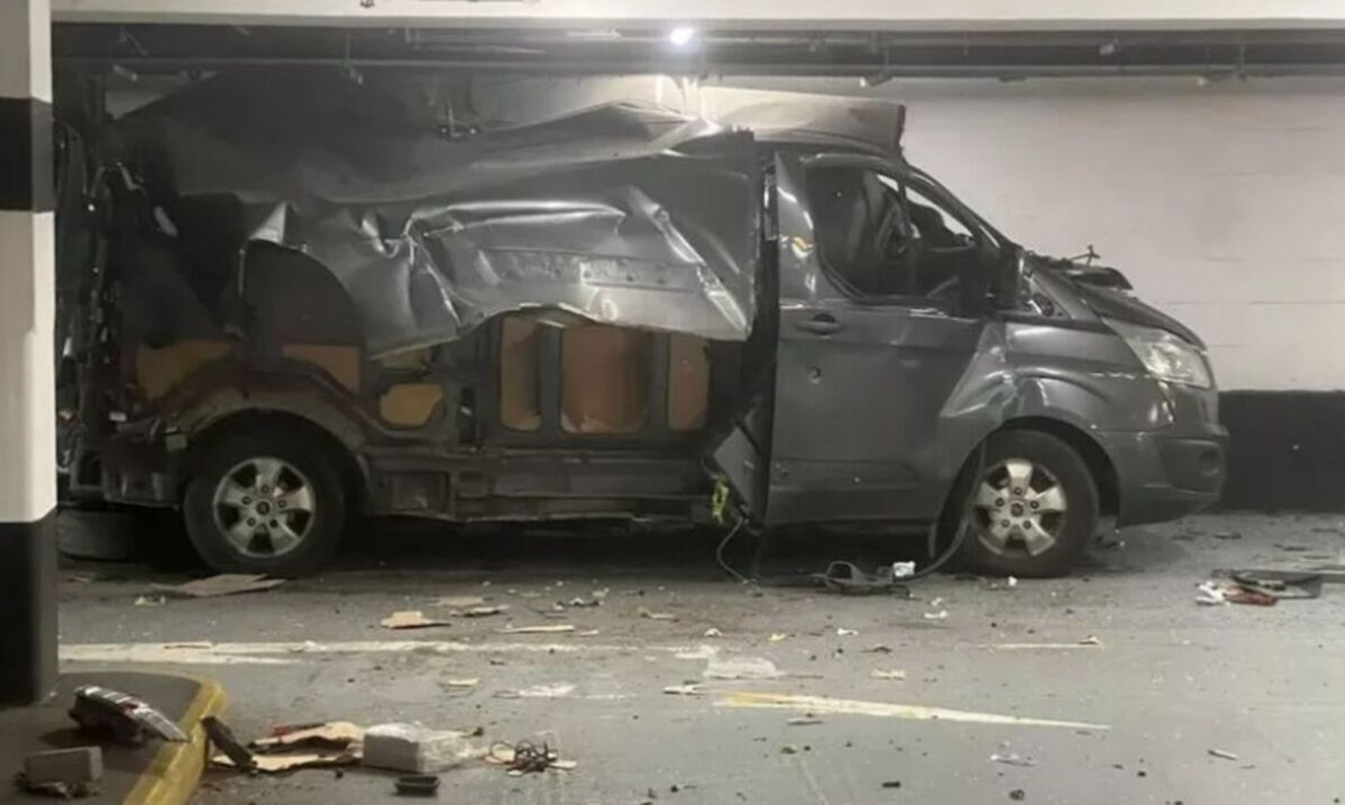 Οι εικόνες από το σημείο δείχνουν το βαν σχεδόν διαλυμένο, με σπασμένα παράθυρα και εμφανείς ζημιές στο εσωτερικό του.