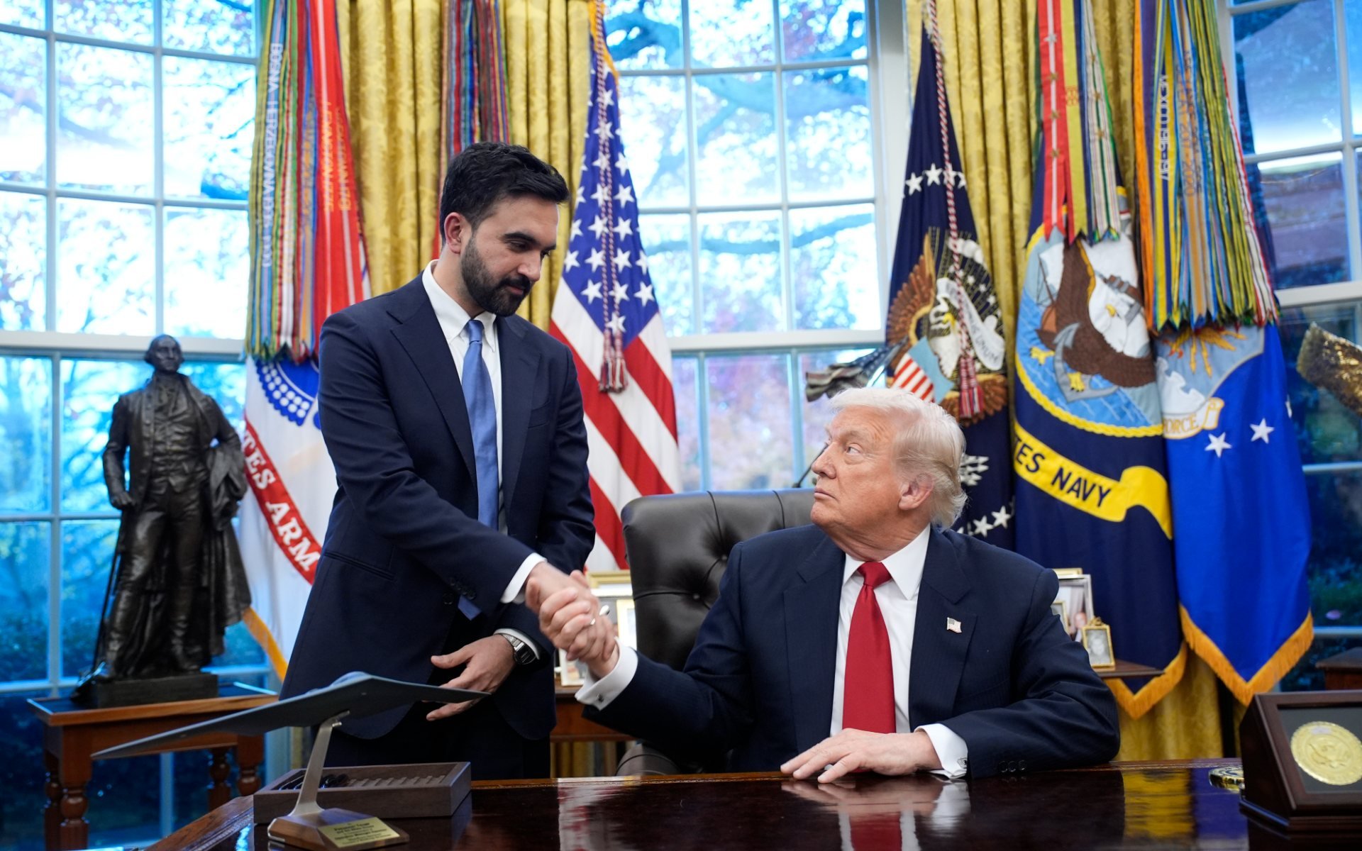 O Ντόναλντ Τραμπ υποδέχθηκε στον Λευκό Οίκο τον Ζόραν Μαμντάνι. Η 10λεπτη ανταλλαγή απόψεων ολοκληρώθηκε σε μια συνάντηση, που επικεντρώθηκε στην προσιτή τιμή, την στέγαση και την δημόσια ασφάλεια. Ωστόσο, υπήρχε ένταση μεταξύ του νέου δημάρχου και του προέδρου των ΗΠΑ.