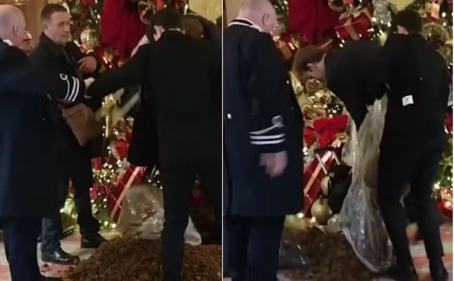 Άνοιξαν τις βαλίτσες και αναποδογύρισαν το περιεχόμενο κάτω από το χριστουγεννιάτικο δέντρο, πριν προλάβουν να επέμβουν υπάλληλοι του Ritz για να τους απομακρύνουν.