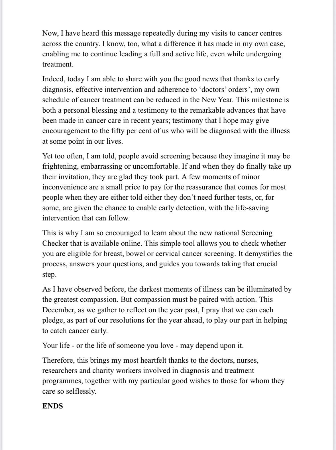 «Είμαι σήμερα σε θέση να σας ανακοινώσω μια καλή είδηση: χάρη στην έγκαιρη διάγνωση, την αποτελεσματική παρέμβαση και την τήρηση των ιατρικών εντολών, το θεραπευτικό πρόγραμμά μου για τον καρκίνο ενδέχεται να μειωθεί με τη νέα χρονιά», είπε, χαρακτηρίζοντας «προσωπική ευλογία» αυτήν την εξέλιξη.