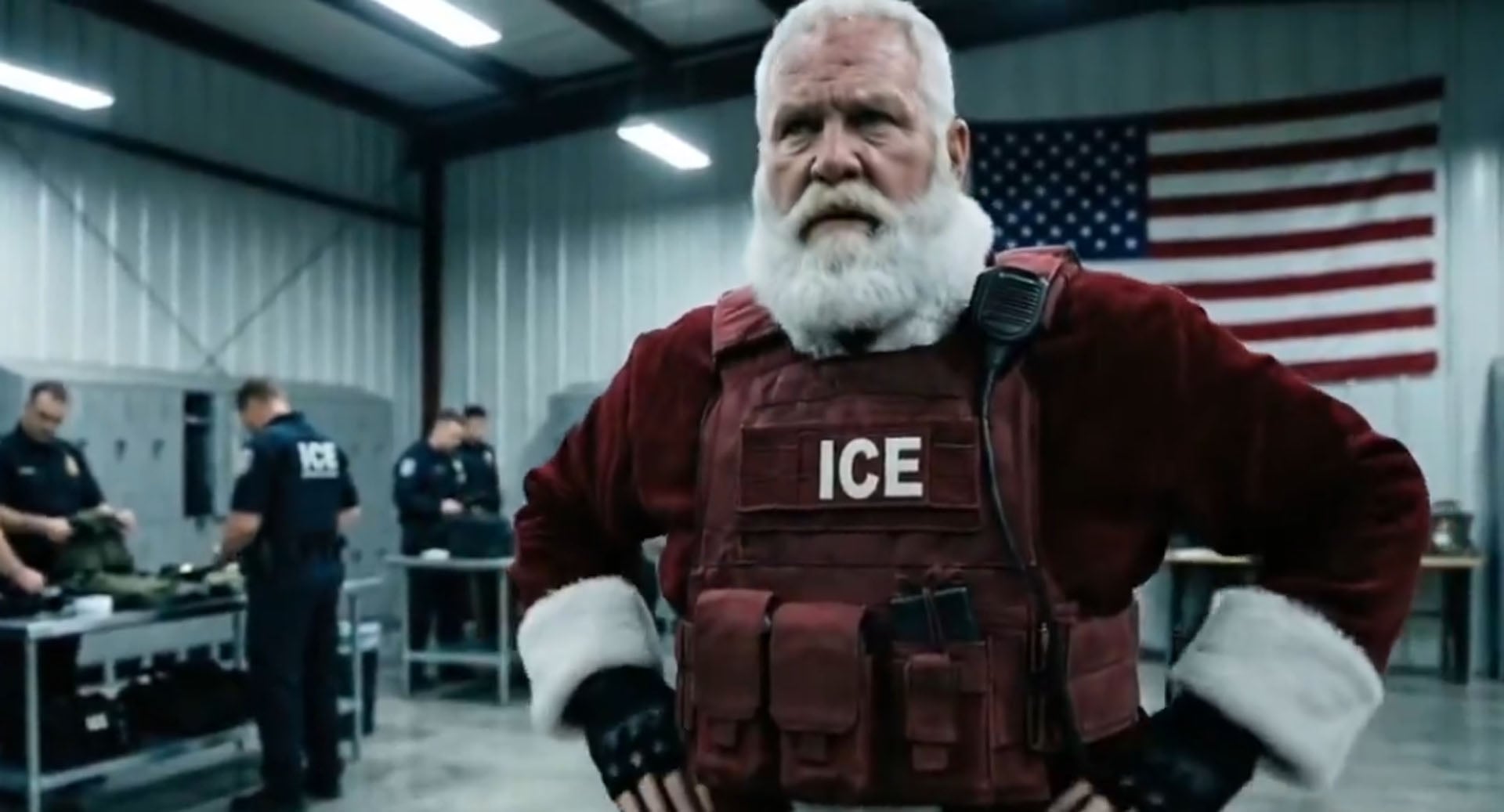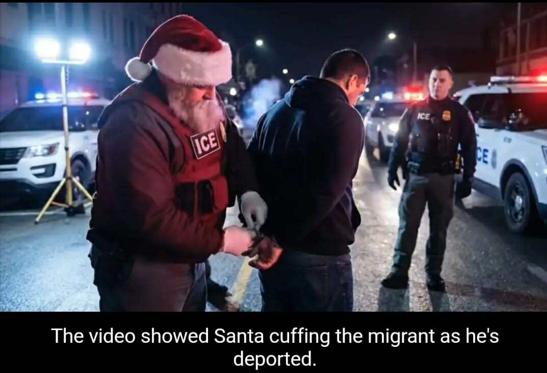 Το εν λόγω βίντεο δημοσιεύτηκε στο X και δείχνει έναν αστραφτερό Άγιο Βασίλη ντυμένο με ένα κόκκινο αλεξίσφαιρο γιλέκο ICE να φοράει χειροπέδες σε έναν παράνομο μετανάστη στο δρόμο.