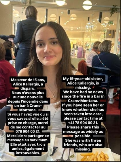Θρήνος στο Crans-Montana, καθώς πληροφορίες αναφέρουν ότι ταυτοποιήθηκε η σορός της 15χρονης Αλίκης Καλλέργη.