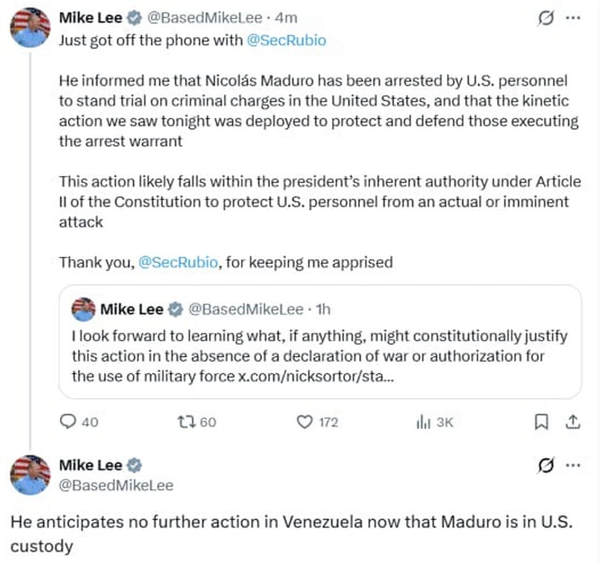 Σύμφωνα με τον γερουσιαστή Μάικ Λι ο Υπουργός Εξωτερικών των ΗΠΑ Μάρκο Ρούμπιο φέρεται να του είπε ότι ο Νικολάς Μαδούρο συνελήφθη από προσωπικό των ΗΠΑ για να αντιμετωπίσει ποινικές κατηγορίες στις Ηνωμένες Πολιτείες και ότι η στρατιωτική δράση που παρατηρήθηκε έγινε για την προστασία όσων πραγματοποίησαν τη σύλληψη.