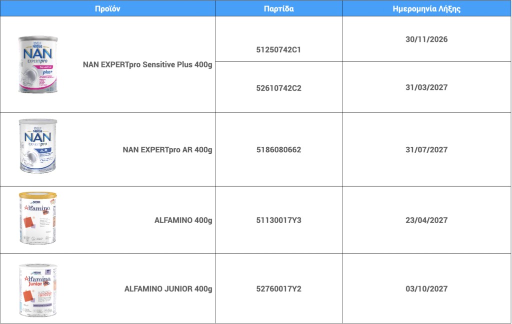 Πρόκειται για τις παρτίδες των σκευασμάτων SMA, BEBA, NAN και Alfamin, που η Nestle έχει ανακαλέσει λόγω πιθανής μόλυνσης με σερεουλίδη, τοξίνη που μπορεί να προκαλέσει ναυτία και έμετο.