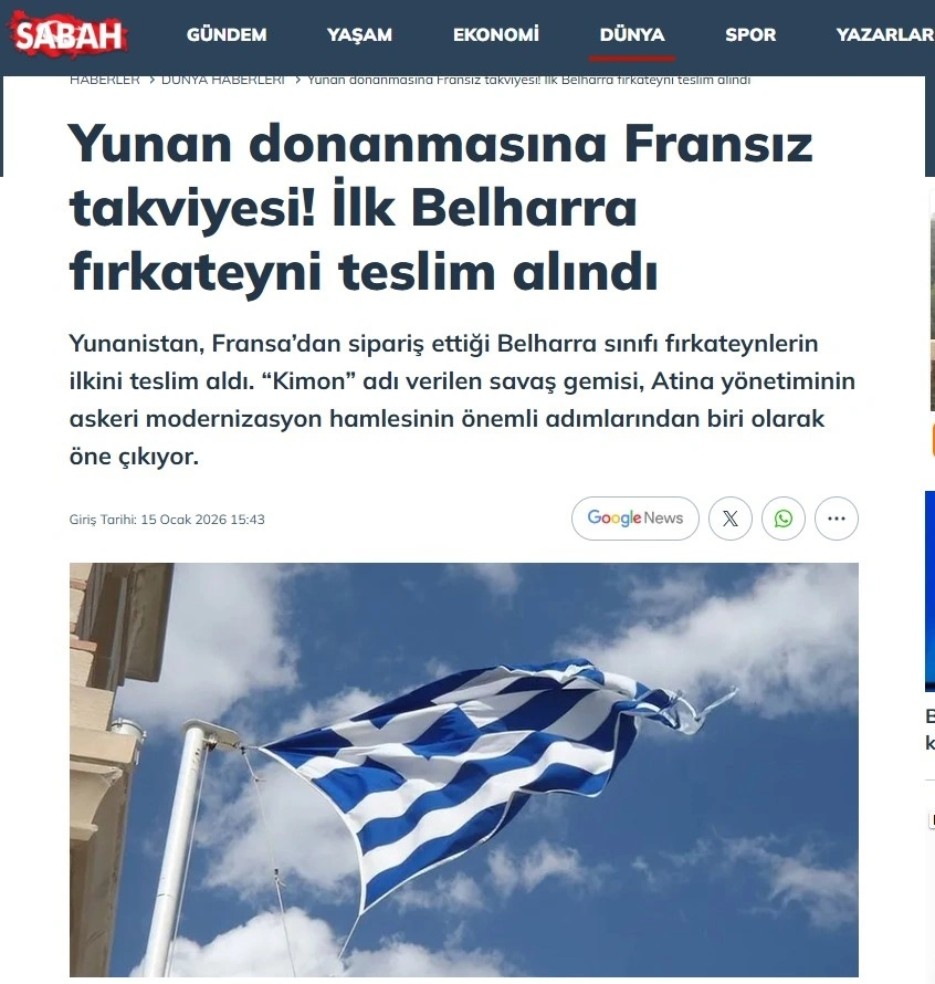 «Γαλλικές ενισχύσεις για το ελληνικό ναυτικό! Παραδόθηκε η πρώτη φρεγάτα Belharra», είναι ο τίτλος της Sabah, που σχολιάζει ότι η φρεγάτα «ΚΙΜΩΝ» αποτελεί ένα σημαντικό βήμα στην προσπάθεια εκσυγχρονισμού των Ενόπλων Δυνάμεων της Ελλάδας.