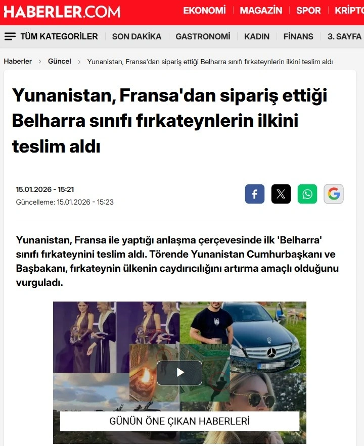 Από την πλευρά της η ιστοσελίδα Haberler.com αναφέρει ότι η Ελλάδα παρέλαβε στην Σαλαμίνα την πρώτη φρεγάτα κλάσης Belharra από την Γαλλία. Και δημοσιεύει την δήλωση του Κυριάκου Μητσοτάκη ότι ο «Κίμων» είναι μέρος της προσπάθειας αναβάθμισης των ελληνικών Ενόπλων Δυνάμεων.