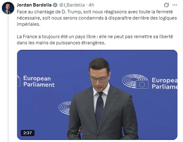 O Ζορντάν Μπαρντελά, ο πρόεδρος του Εθνικού Συναγερμού και επικεφαλής της ομάδας των Πατριωτών στο Ευρωπαϊκό Κοινοβούλιο κάλεσε σήμερα τους Ευρωπαίους να απορρίψουν την «υποταγή» στις απειλές του Ντόναλντ Τραμπ για τη Γροιλανδία και να απαντήσουν με σθένος.