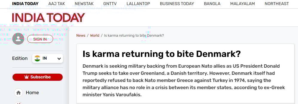 Για «κάρμα» κάνει λόγο το indiatoday. Και αναφέρει ότι «το 1974, κατά τη διάρκεια της κρίσης της Κύπρου, όταν ξέσπασαν εντάσεις μεταξύ δύο μελών του ΝΑΤΟ, δηλαδή της Ελλάδας και της Τουρκίας, η Δανία ήταν η χώρα η οποία φέρεται να ανακοίνωσε ότι η εντολή της στρατιωτικής ομάδας δεν ήταν να υπερασπιστεί κανένα κράτος-μέλος από ένα άλλο, αφήνοντας την Κύπρο αβοήθητη στα χέρια του τουρκικού Αττίλα με τα γνωστά αποτελέσματα».
