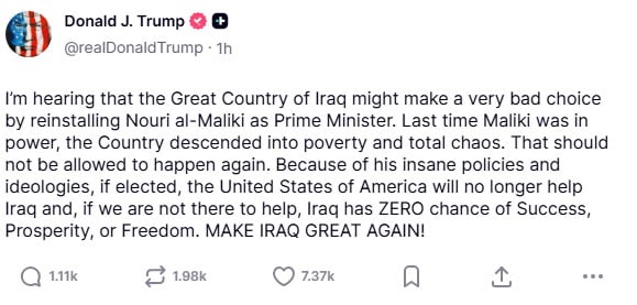 «Ακούω ότι η Μεγάλη Χώρα του Ιράκ μπορεί να κάνει μια πολύ κακή επιλογή επανατοποθετώντας τον Νούρι αλ-Μαλίκι ως Πρωθυπουργό. Την τελευταία φορά που ήταν στην εξουσία, η χώρα βυθίστηκε στη φτώχεια και το απόλυτο χάος.