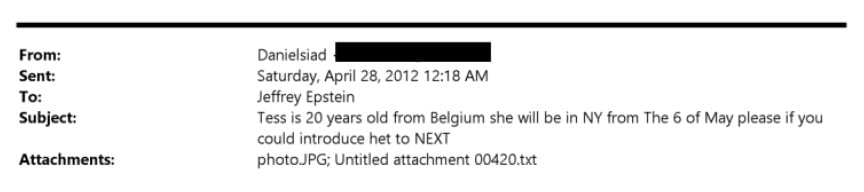 Σε μια άλλη ανταλλαγή, άγνωστος αποστολέας ανέφερε στον Epstein ότι είχαν πραγματοποιήσει βιντεοκλήση με μια γυναίκα που φαινόταν «αρκετά συμπαθητική», ακόμα κι αν «δεν μπορούσαν να δουν το πρόσωπό της πολύ καλά». Η γυναίκα, η οποία αναφέρεται ότι «περίμενε τη βίζα», περιγράφηκε ως άτομο που είχε προηγουμένως «προσλάβει θέσεις εργασίας για ένα πρακτορείο μοντέλων (μπορεί να έχει και άλλους υποψηφίους;). Νομίζω ότι θα τα πάει καλά μετά τη συζήτησή μας».