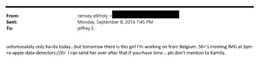 Μια σειρά email του 2010 που στάλθηκε στον Epstein περιλαμβάνει περιγραφή μιας γυναίκας που αναγνωρίστηκε ως «Kelly C.», η οποία παρέχεται από ένα «πρακτορείο μοντέλων» με έδρα τις Βρυξέλλες, το Casting Factory.