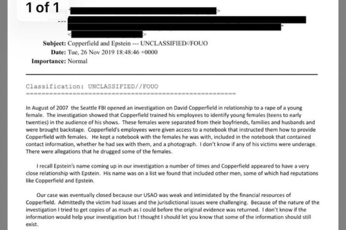 Ένας πράκτορας (πιθανότατα από το Seattle Field Office του FBI) γράφει σε συνάδελφο ή ανώτερο σχετικά με παλαιότερη έρευνα του 2007 εναντίον του David Copperfield, του διάσημου μάγου. Η έρευνα ξεκίνησε τον Αύγουστο του 2007 μετά από καταγγελία βιασμού από νεαρή γυναίκα, ηλικίας περίπου 20 ετών, από το Σιάτλ.