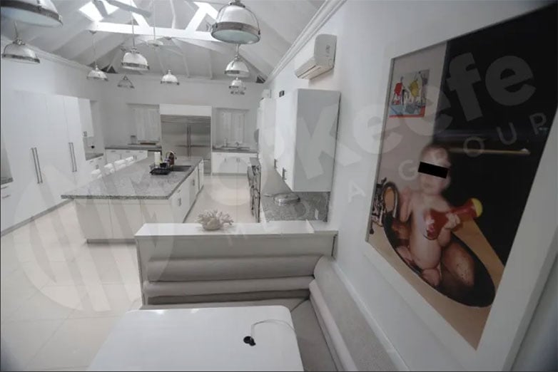 Ιδιαίτερη εντύπωση προκαλεί και ένα κάδρο που βρίσκεται πάνω από τους παρευρισκόμενους και απεικονίζει παιδική φιγούρα σε γυμνή μορφή. Αντίστοιχο κάδρο έχει εντοπιστεί και σε άλλα σημεία της βίλας του Επστάιν, σύμφωνα με φωτογραφικό υλικό που έχει ήδη δει το φως της δημοσιότητας.