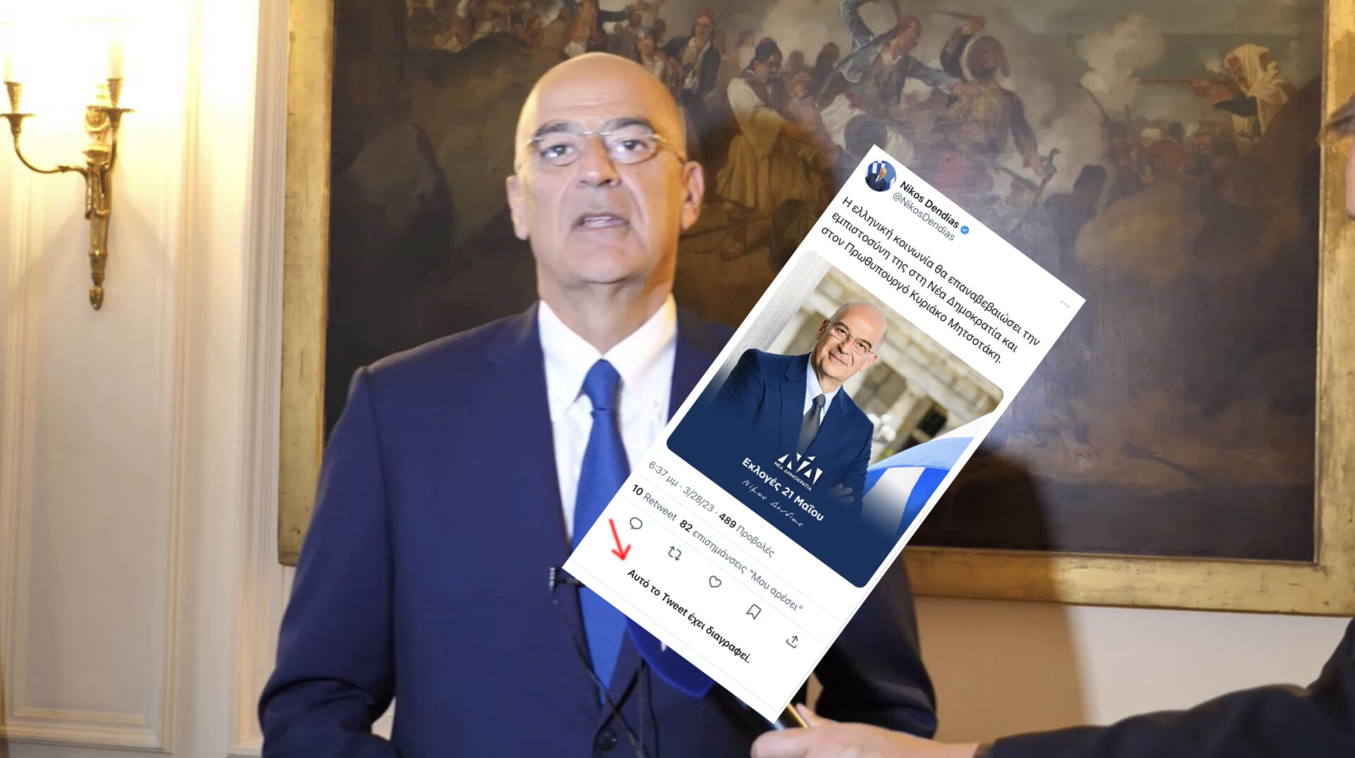 Κάποιες φορές όμως ο ενθουσιασμός είναι κακός σύμβουλος. Αυτό φάνηκε από το ενθουσιώδες tweet που ανέβασε στον προσωπικό του λογαριασμό ο Νίκος Δένδιας, όπου ναι μεν έκανε αναφορά στον πρωθυπουργό, κυριαρχούσε όμως η δική του φωτογραφία σε πρωθυπουργική μάλιστα πόζα!