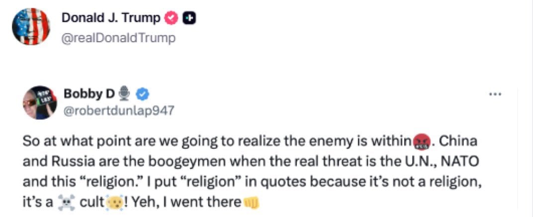 «Πότε θα συνειδητοποιήσουμε ότι η πραγματική απειλή είναι εντός των τειχών; Η Κίνα και η Ρωσία είναι απλώς «μπαμπούλες», ενώ η πραγματική απειλή είναι ο ΟΗΕ, το ΝΑΤΟ και αυτή η «θρησκεία» (εννοεί το Ισλάμ)»!