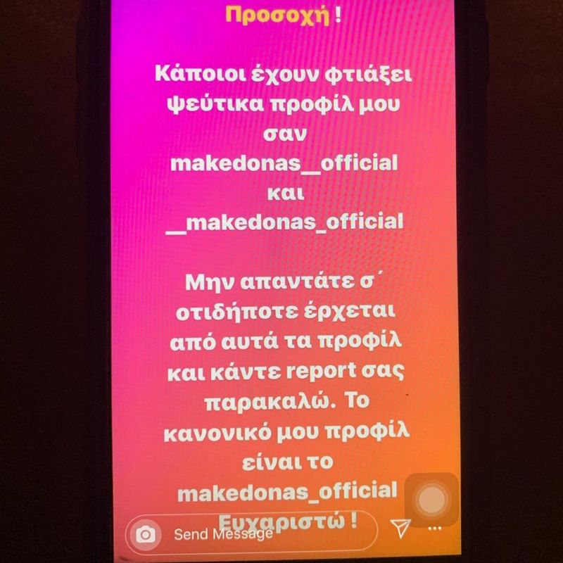 Μέσα από τον προσωπικό του λογαριασμό στο Instagram, θέλησε να ενημερώσει και να προειδοποιήσει τους διαδικτυακούς του φίλους ότι υπάρχουν ψεύτικοι λογαριασμοί και παράλληλα τους κάλεσε να κάνουν αναφορά.