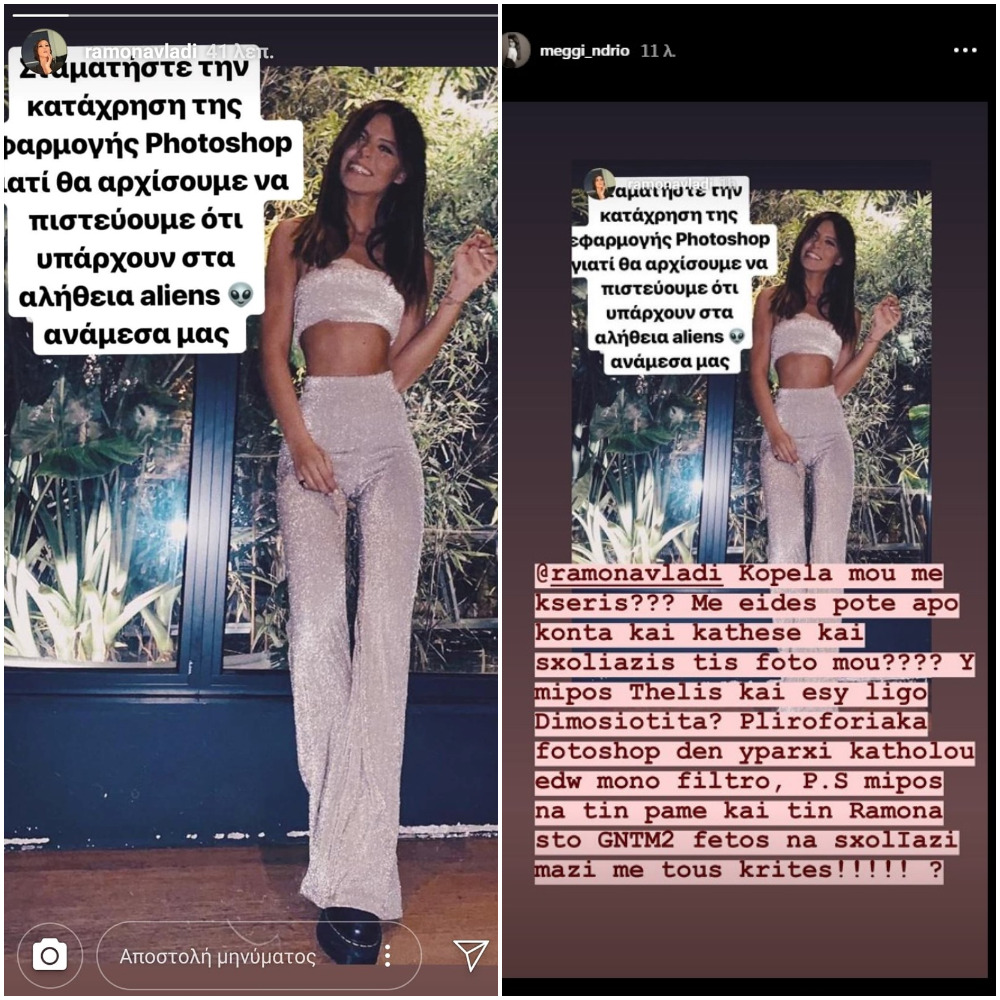Με απαντητικό Instagram story της, η Μέγκι επετέθη στη ρουμανικής καταγωγής Influencer, ισχυριζόμενη, μεταξύ άλλων, ότι η Ραμόνα την επέλεξε για λόγους δημοσιότητας, ενώ σχολίασε ειρωνικά την «επιθυμία» της να είναι στην κριτική επιτροπή του GNTM 2.
