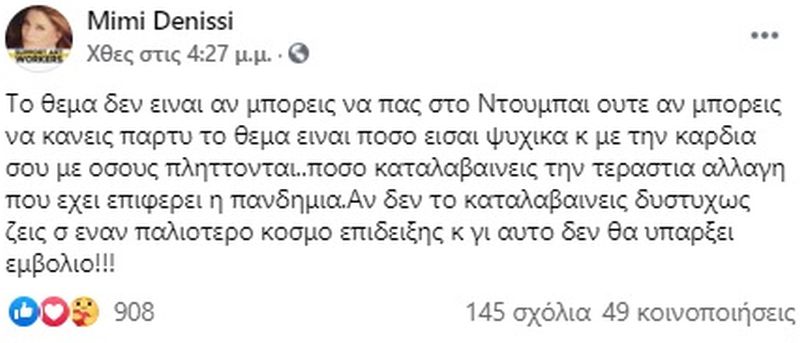 «Το θέμα δεν είναι αν μπορείς να πας στο Ντουμπάι ούτε αν μπορείς να κάνεις πάρτι. Tο θέμα είναι πόσο είσαι ψυχικά και με την καρδιά σου με όσους πλήττονται… πόσο καταλαβαίνεις την τεράστια αλλαγή που έχει επιφέρει η πανδημία. Αν δεν το καταλαβαίνεις δυστυχώς ζεις σ’ έναν παλιότερο κόσμο επίδειξης και γι’ αυτό δεν θα υπάρξει εμβόλιο!» έγραψε η ηθοποιός και θεατρική παραγωγός.