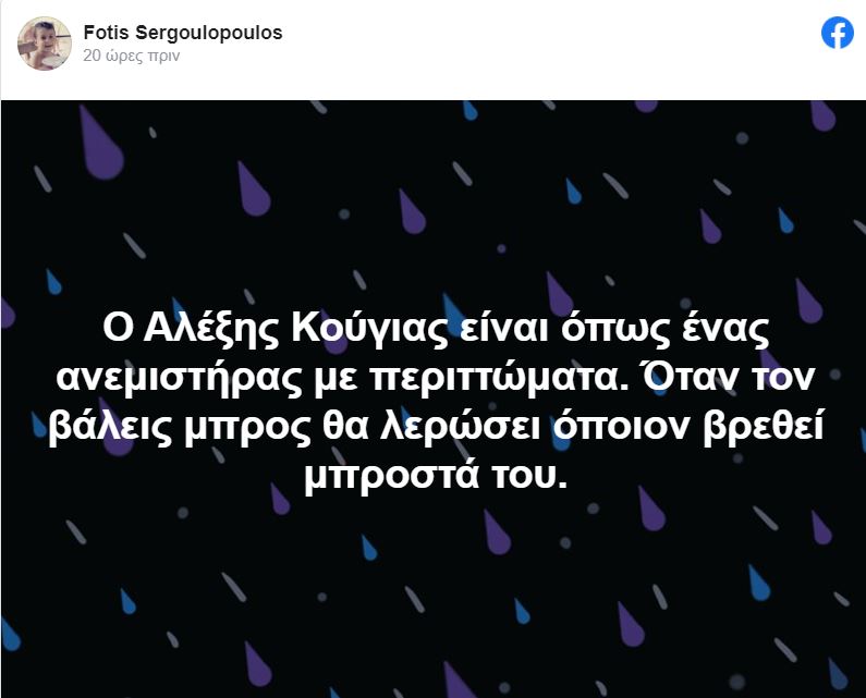 Ανάμεσά τους και ο γνωστός παρουσιαστής Φώτης Σεργουλόπουλος, ο οποίος μέσα από τον προσωπικό του λογαριασμό στο Facebook, παρομοίασε τον Αλέξη Κούγια με έναν «ανεμιστήρα με περιττώματα»