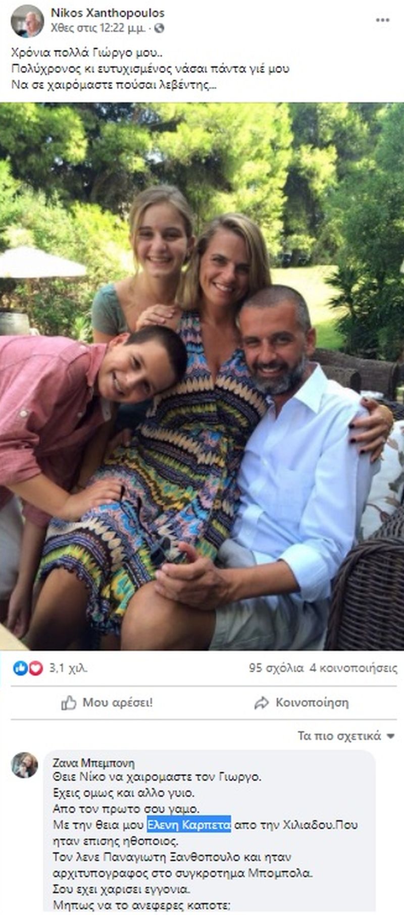 Το σχόλιο μιας ανιψιάς του όμως χάλασε το όμορφο «κλίμα» του εορτασμού. Κάτω από την φωτογραφία, η συγγενής του ανέφερε ότι ο ίδιος έχει «ξεχάσει» τον πρώτο του γιο από τον γάμο του με την ηθοποιό Ελένη Καρπέτα: «Θείε Νίκο να χαιρόμαστε τον Γιώργο. Έχεις όμως και άλλο γιο. Από τον πρώτο σου γάμο με τη θεία μου, Ελένη Καρπέτα από την Χιλιαδου, που ήταν επίσης ηθοποιός. Τον λένε Παναγιώτη Ξανθόπουλο και ήταν αρχιτυπογράφος στο συγκρότημα Μπόμπολα. Σου έχει χαρίσει εγγόνια. Μήπως να το ανέφερες κάποτε; Το λέω με αγάπη» σχολίασε.