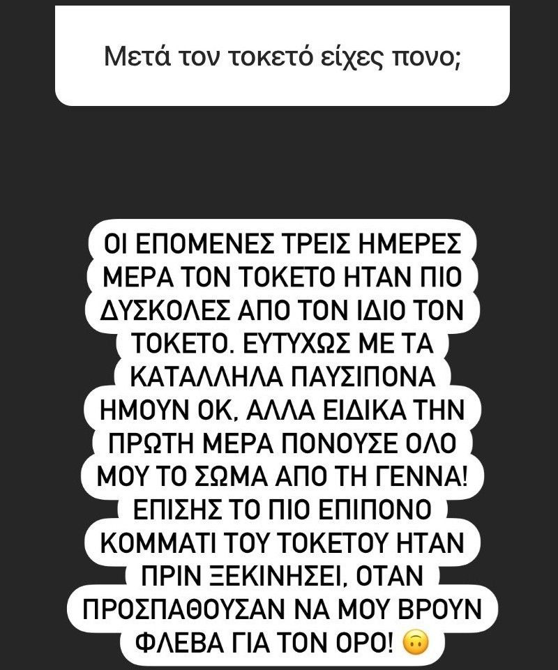 Μάλιστα, εξήγησε πως οι μέρες μετά τον τοκετό ήταν εκείνες που την δυσκόλεψαν περισσότερο και από την ίδια την διαδικασία της γέννας. «Ευτυχώς με τα κατάλληλα παυσίπονα ήμουν οκ. Αλλά ειδικά την πρώτη μέρα, πονούσε όλο μου το σώμα από τη γέννα. Επίσης το πιο επίπονο κομμάτι του τοκετού ήταν πριν ξεκινήσει. Όταν προσπαθούσαν να μου βρουν φλέβα για τον ορό» ανέφερε.