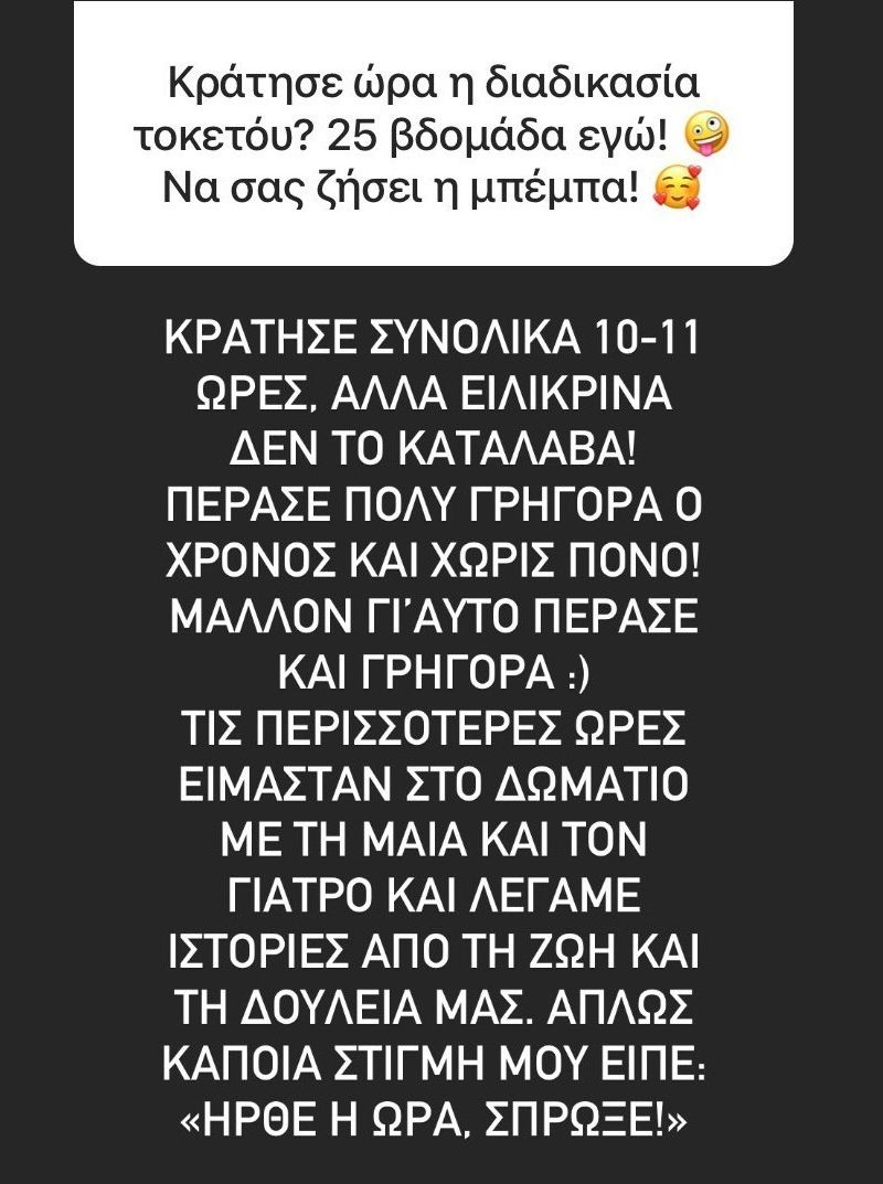 «Ο τοκετός κράτησε συνολικά 10-11 ώρες, αλλά ειλικρινά δεν το κατάλαβα. Πέρασε πολύ γρήγορα ο χρόνος και χωρίς πόνο. Μάλλον για αυτό πέρασε γρήγορα. Τις περισσότερες ώρες ήμασταν στο δωμάτιο με τη μαία και τον γιατρό και λέγαμε ιστορίες από τη ζωή και τη δουλειά μας. Απλώς κάποια στιγμή μου είπε: “Ήρθε η ώρα, σπρώξε”» εξήγησε η παρουσιάστρια.
