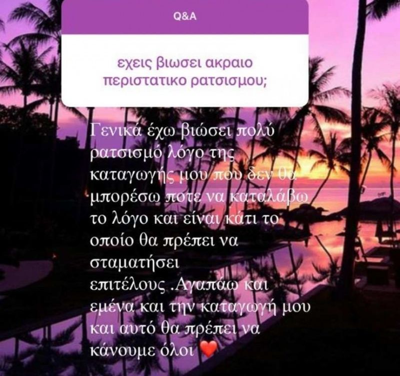 Η ίδια αυτή τη φορά και έχοντας ελεύθερο χρόνο επέλεξε να κάνει ένα Q&A στο Instagram. Μάλιστα, ανάμεσα στα ερωτήματα που δέχτηκε, λοιπόν, ήταν και αυτό που αφορούσε στον ρατσισμό που έχει βιώσει με την ίδια να δίνει την δική της απάντηση.