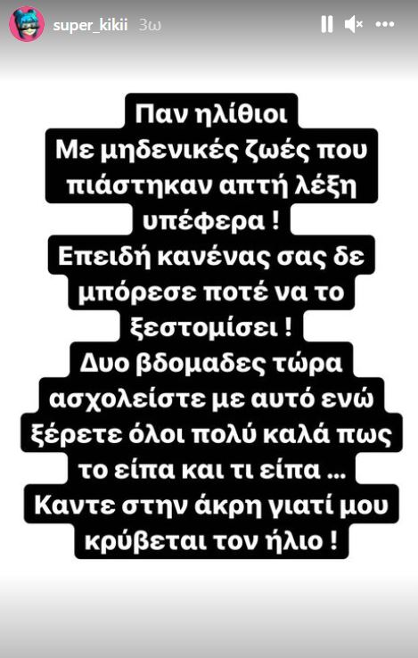 Το εν λόγω θέμα όμως αναπαράχθηκε και από άλλες εκπομπές γεγονός το οποίο εκνεύρισε την Super Κική, καθώς ένιωσε ότι διαστρεβλώνονται οι δηλώσεις της και στοχοποιείται χωρίς λόγο. H νεαρή «ifluencer των φτωχών», όπως αυτοπαρουσιάζεται και η ίδια, θέλησε να ξεκαθαρίσει για ακόμη μία φορά την θέση της και μέσω του προσωπικού της λογαριασμού στο instagram, προχώρησε σε ένα δημόσιο ξέσπασμα κατά των δημοσιογράφων.