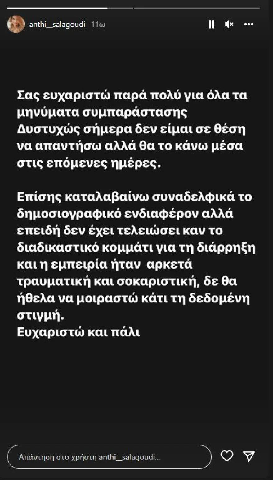 «Σας ευχαριστώ πάρα πολύ για όλα τα μηνύματα συμπαράστασης. Δυστυχώς σήμερα δεν είμαι σε θέση να απαντήσω αλλά θα το κάνω μέσα στις επόμενες μέρες. Επίσης καταλαβαίνω συναδελφικά το δημοσιογραφικό ενδιαφέρον αλλά επειδή δεν έχει τελειώσει καν το δικαστικό κομμάτι για τη διάρρηξη και επειδή η εμπειρία ήταν αρκετά τραυματική και σοκαριστική, δεν θα ήθελα να μοιραστώ κάτι τη δεδομένη στιγμή. Ευχαριστώ και πάλι», έγραψε αρχικά η Ανθή Σαλαγκούδη.
