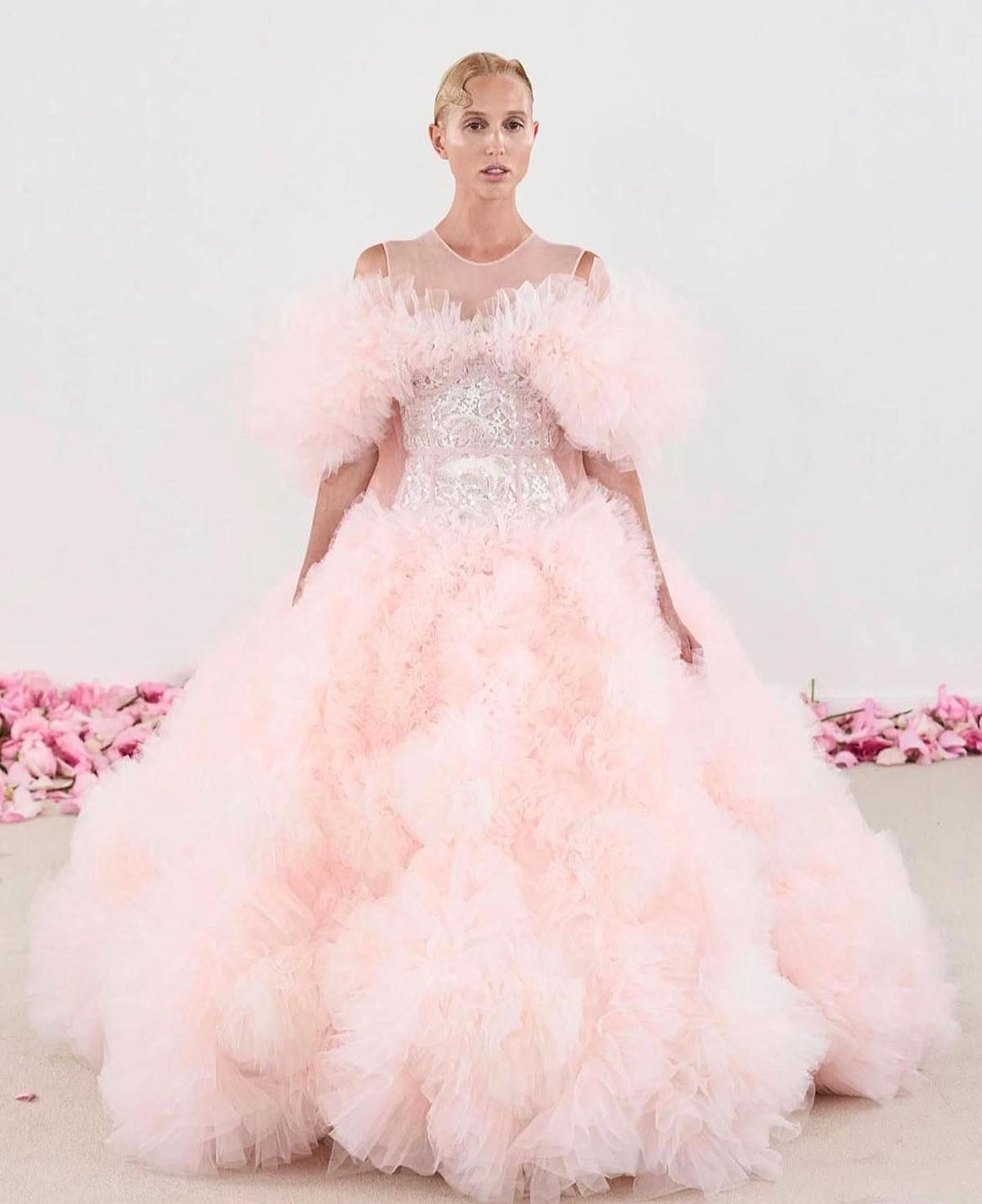 Η Μαρία Ολυμπία όχι μόνο συμμετείχε στο σόου, αλλά ήταν και μία από τις πρωταγωνίστριές του, καθώς έκλεισε την παράσταση με μία τελείως διαφορετική από αυτή που την έχουμε συνηθίσει εμφάνιση, με αποτέλεσμα να δυσκολευτεί κανείς να την αναγνωρίσει στην αρχή. Η 27χρονη jet-setter και fashion icon φορούσε μια ονειρική couture τουαλέτα σε ροζ κουφετί χρώμα όλο τούλι, ενώ το πάνω μέρος αποτελούνταν από έναν στενό δαντελένιο κορσέ και διαφάνεια στους ώμους. Η εμφάνισή της ολοκληρώθηκε με wet look χτένισμα με κύματα στη φράντζα.
