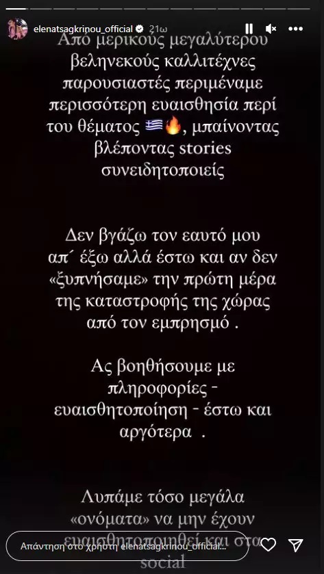 Λυπάμαι τόσο «μεγάλα» ονόματα να μην έχουν ευαισθητοποιηθεί και στα social», έγραψε χαρακτηριστικά σε ένα story που ανάρτησε στο instagram account της.
