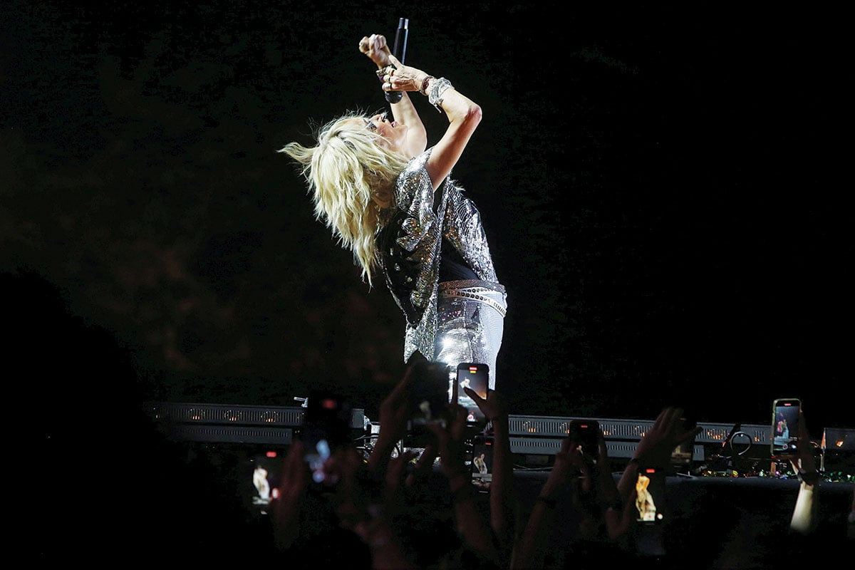 Η τραγουδίστρια, που συμπληρώνει 50 χρόνια στη μουσική βιομηχανία, σύμφωνα και με το Mykonos liveTV κατέφθασε με πολυτελές τζιπ, ντυμένη με κίτρινο φλούο σακάκι, γαλάζιο παντελόνι με ασημένια κρόσσια στο κάτω μέρος και λευκές μπότες, και μόλις ανέβηκε στη σκηνή δεκάδες πυροτεχνήματα έκαναν τη νύχτα μέρα.