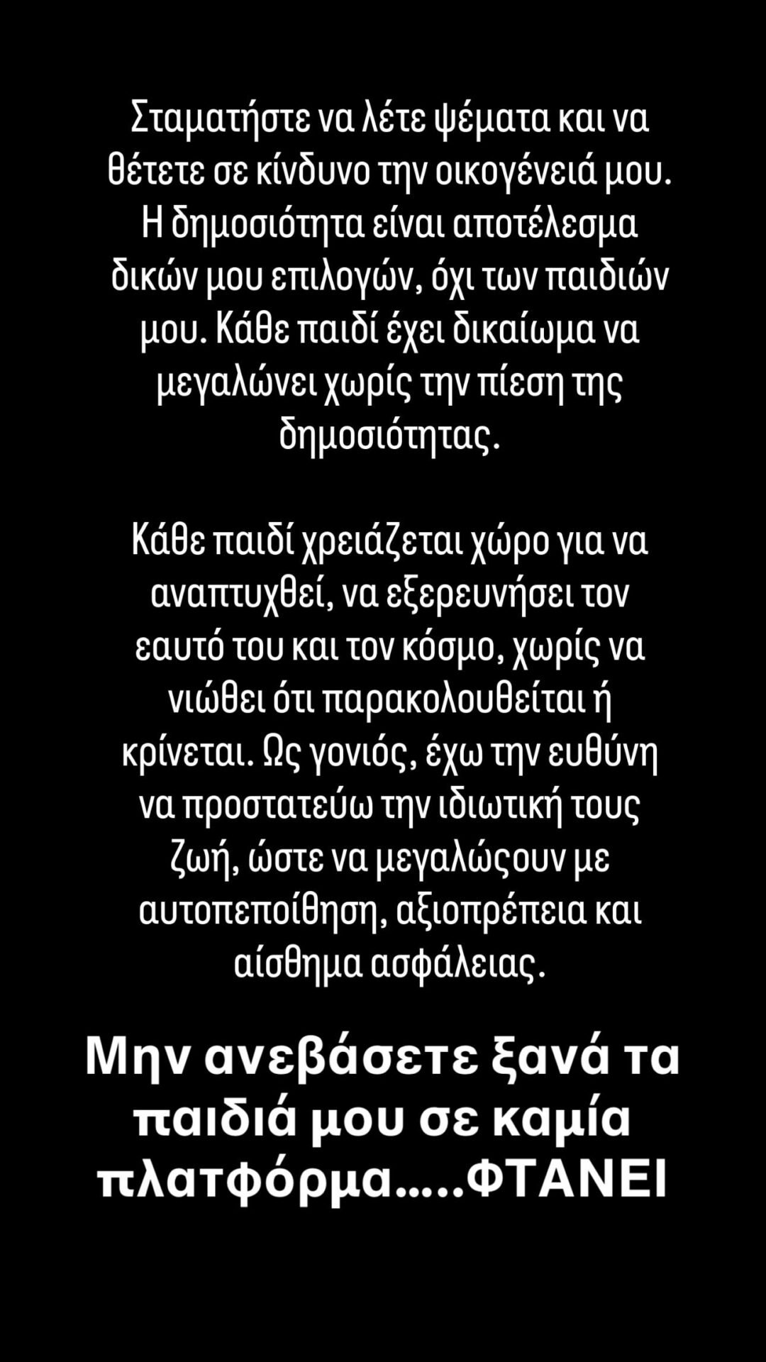 Μην ανεβάσετε ξανά τα παιδιά μου σε καμία πλατφόρμα… ΦΤΑΝΕΙ», έγραψε χαρακτηριστικά.