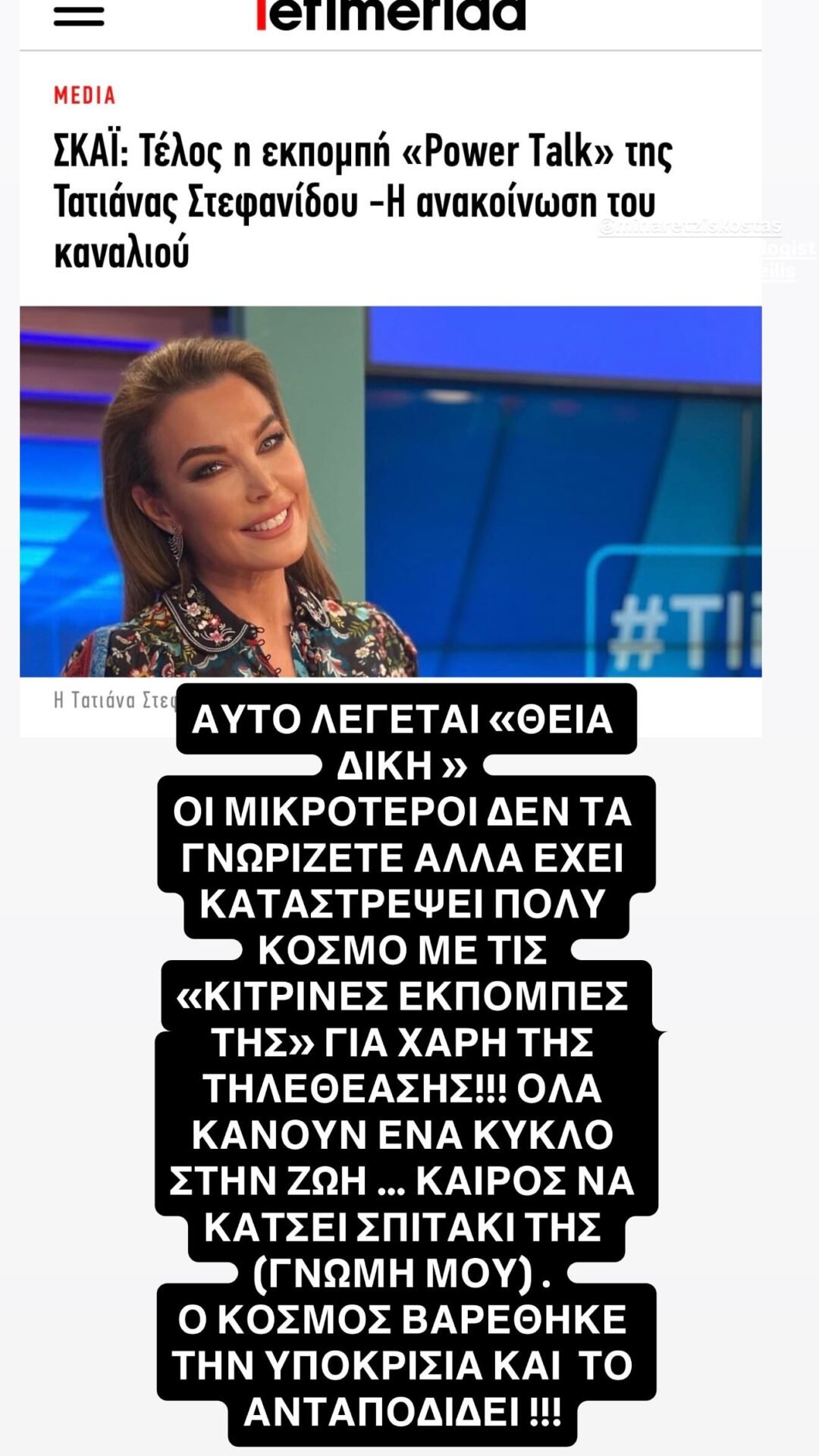 Μέσα από τον προσωπικό της λογαριασμό στο instagram η τραγουδίστρια ανέβασε story με σχετική είδηση αφήνοντας σαφείς αιχμές για το παρελθόν της παρουσιάστριας και τον τρόπο με τον οποίο κάλυπτε τηλεοπτικά θέματα.
